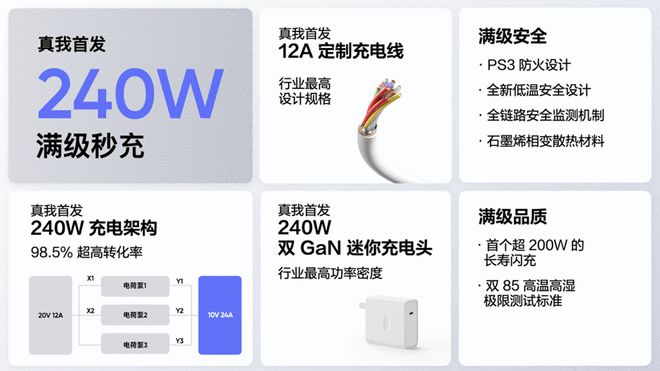 1月5日动静,真我realme今日正式推出全球首个商用的240W满级秒充。240W满级秒充从整机、电池、充电器、充电线等方面进行周全进级。为实现240W满级功率,真我带来三项行业首发的闪充手艺。