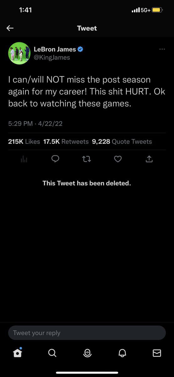 不会再错过季后赛?“我的生活生计不克不及也不会再错过季后赛了,这种感受太TM伤人了。好了,此刻从头看角逐吧。”有眼尖的媒体发现勒布朗不知不觉已经删失落了这条推文,但仍是被发现了。这似乎表白了勒布朗对今朝湖人场合排场的灰心,对于打进季后赛缺乏决定信念。湖人今朝13胜20负,排在西部第13,但距离第10的附加赛区域只差2.5场,从时候上来说,足够去追。勒布朗也连结着不错的表示,本赛季至今,他场均进献27.8分8.1篮板6.6助攻,投篮射中率是49.6%,三分球射中率是30.6%。 詹皇4月发推说不会再错过季后赛 此刻删了这条内容