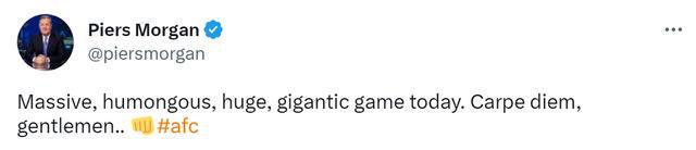 直播吧4月9日讯 北京时候23:30,英超第30轮阿森纳vs利物浦,闻名枪迷皮尔斯-摩根难掩冲动表情,晒出首发图,并用四个分歧的单词表达“重年夜”。摩根:今天有重年夜(massive),重年夜(humongous),重年夜(huge),重年夜(gigantic)的角逐。实时行乐,师长教师们…