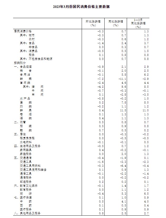 (原题目:2023年3月份居平易近消费价钱同比上涨0.7% 环比下降0.3%) 2023年3月份,全国居平易近消费价钱同比上涨0.7%。此中,城市上涨0.7%,农村上涨0.6%;食物价钱上涨2.4%,非食物价钱上涨0.3%;消费品价钱上涨0.5%,办事价钱上涨0.8%。1—3月平均,全国居平易近消费价钱比上年同期上涨1.3%。3月份,全国居平易近消费价钱环比下降0.3%。此中,城市下降0.3%,农村下降0.3%;食物价钱下降1.4%,非食物价钱持平;消费品价钱下降0.5%,办事价钱上涨0.1%。