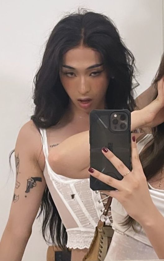 哈利站在伴侣的死后,戴着假发,看起来就跟原生发似的,他身穿白色吊带,露出小蛮腰,手臂上、胸口处都有纹身,哈利化着很浓的欧美妆,眉毛和眼线都好夸张,眼神迷离,姿态娇媚。